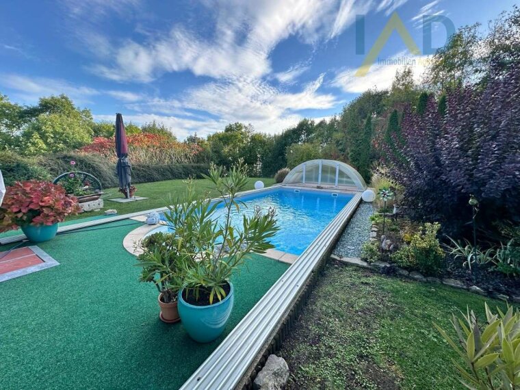 Ein absolutes Highlight ist der großzügige, beheizbare Pool mit Gegenstromanlage und Überdachung – ein echtes Alleinstellungsmerkmal, das ganzjährig für Erholung sorgt. Umgeben von gepflegtem Rasen und Sonnenflächen wird das Leben im Freien zum Genuss.