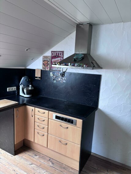 Die Küche wirkt modern und fügt sich harmonisch in den Wohnungsgrundriss ein; ein zusätzliches Dachfenster sorgt für Tageslicht.