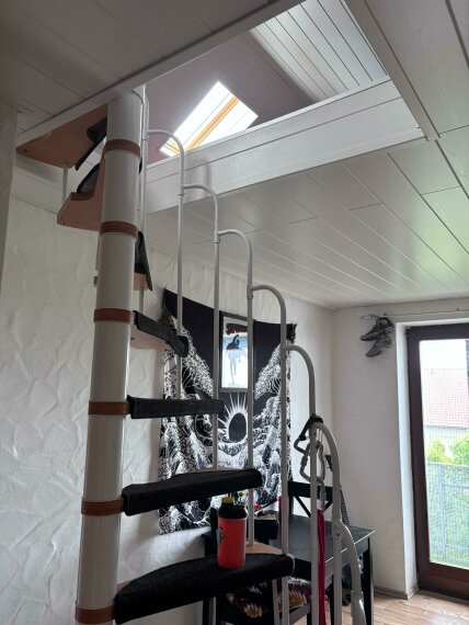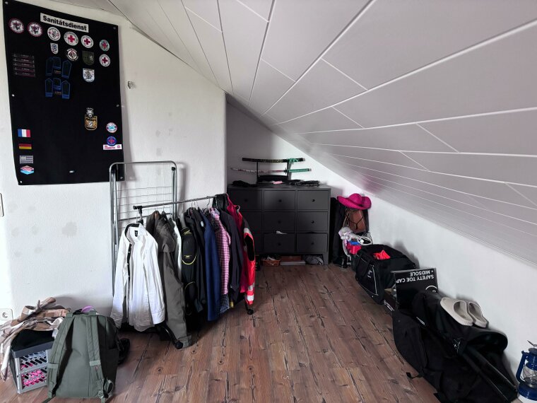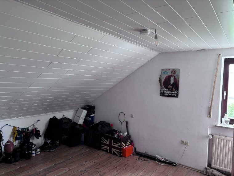 Die rund 51 Quadratmeter große Dachgeschosswohnung bietet ein Badezimmer, ein Schlafzimmer, eine Küche, einen Wohn- und Essbereich mit Zugang zum Balkon sowie einen Flur. Ein besonderes Highlight ist der ausgebaute Dachbereich, der sich ideal als zusätzliches Schlafzimmer eignet und der Wohnung einen Maisonette-Charakter verleiht. Die Böden sind mit pflegeleichtem Laminat versehen.