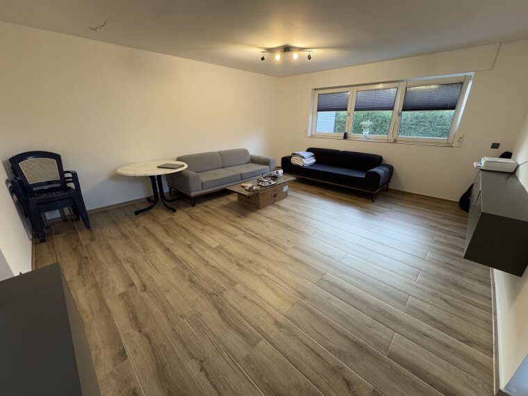 • Hochwertige Bodenbeläge: Im Wohnbereich sorgen Holzoptik-Fliesen für eine warme, moderne Atmosphäre, während das Badezimmer mit eleganten Steinoptik-Fliesen ausgestattet ist