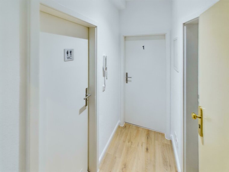 Beim Betreten der Wohnung empfängt Sie ein einladender Eingangsbereich, der den Zugang zu allen Räumen ermöglicht. Die modern ausgestattete Küche bildet das Herzstück der gemeinschaftlichen Nutzung und ist funktional gestaltet. Über den Flur gelangen Sie zu den drei möblierten Zimmern sowie dem stilvollen Badezimmer, die alle in einem sehr gepflegten und bezugsfertigen Zustand präsentiert werden.