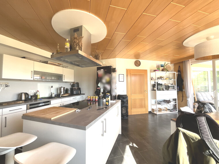 Im 1. Obergeschoss befindet sich eine beeindruckende Wohnung mit einer Wohnfläche von ca. 150 m². Diese lichtdurchflutete Einheit umfasst zwei großzügige Zimmer und eine weitläufige Wohnküche, die direkten Zugang zu einer teilweise überdachten Terrasse von etwa 50 m² bietet – ideal für entspannte Stunden im Freien. Das Badezimmer ist sowohl mit einer Badewanne als auch mit einer Dusche ausgestattet und wird ergänzt durch ein Gäste-WC sowie eine separate Ankleide. Ein Kaminofen im Wohnbereich sorgt für eine behagliche Atmosphäre und lädt zum Verweilen ein.