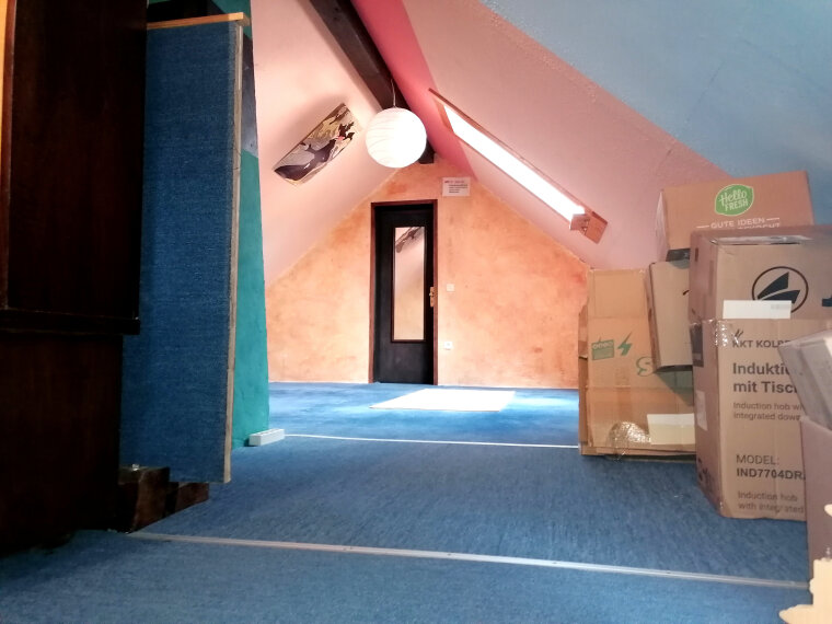 Dachgeschoss: Großes Studiozimmer (ideal als Atelier, Spiel- oder Gästezimmer), Lagerraum mit Wasseranschluss (ggf. ausbaubar)