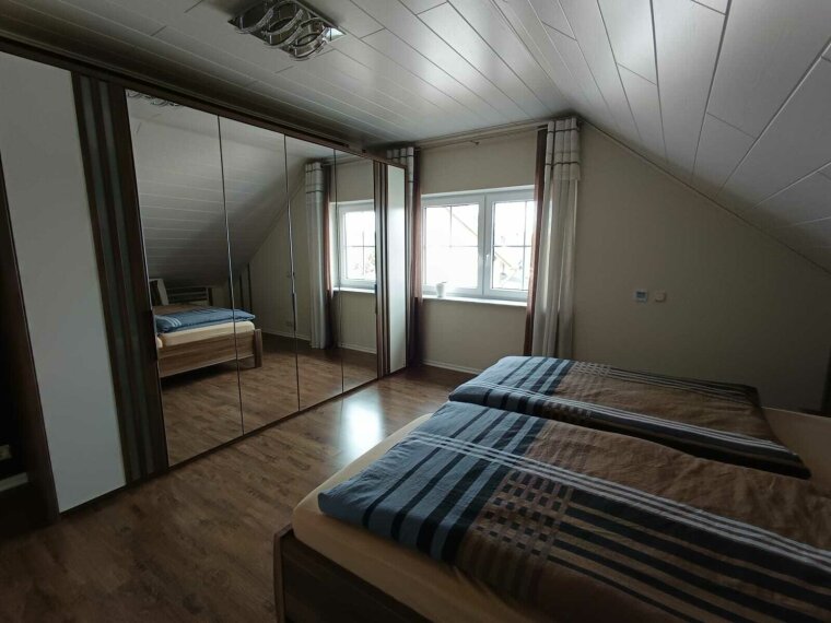 Im Obergeschoss befindet sich eine Einliegerwohnung mit offenem Wohn,-Ess-Küchenbereich, zwei Schlafzimmern und einem Tageslichtbad mit Wanne. Auch zu dieser Wohnung gehört ein Balkon.