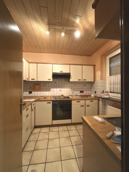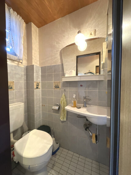 Betreten Sie die Immobilie durch den Haupteingang und entdecken Sie rechts die charmante Einbauküche. Obwohl sie älteren Datums ist, bietet sie alle Funktionen, die Sie für Ihre kulinarischen Kreationen benötigen. Links vom Eingang finden Sie ein separates Gäste-WC, das zusätzlichen Komfort für Ihre Besucher gewährleistet.
