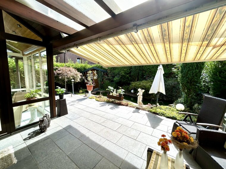 Hier finden Sie einen großzügigen, hellen Wohn- und Essbereich mit offener Küche, ausgestattet mit hochwertigen Elektrogeräten, darunter ein SIEMENS Kaffeevollautomat und eine praktische Küchentheke. Der angrenzende Wintergarten mit geschützter Terrasse öffnet den Wohnraum zum liebevoll gestalteten Garten mit Koi-Teich. An kalten Tagen sorgt der offene Kamin für eine gemütliche und romantische Atmosphäre. Praktisch sind zudem das Gäste-WC und der Hauswirtschaftsraum auf dieser Etage.