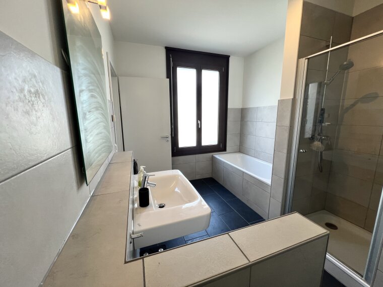 Die Dachterrasse ist mit einer Sonnenmarkise ausgestattet und profitiert von der optimalen Südost-Ausrichtung. Ein modernes En-Suite-Bad mit Badewanne und Dusche, ein zusätzliches Gäste-WC, eine hochwertige Einbauküche sowie Markenmöbel runden das Gesamtpaket ab.