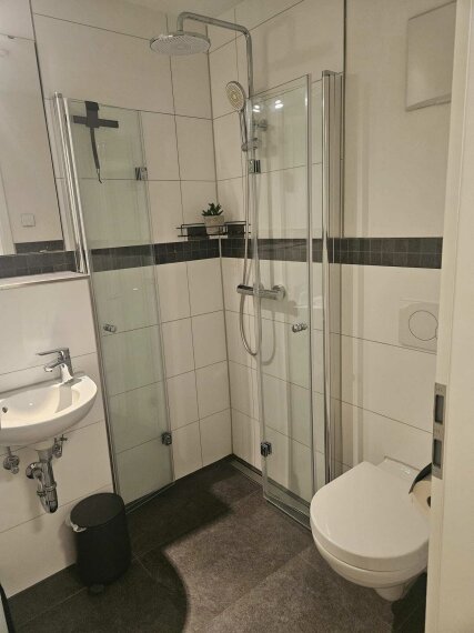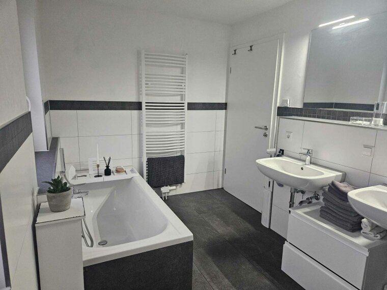 Das Tageslichtbad ist hochwertig ausgestattet und verfügt über Badewanne, bodengleiche Dusche und Doppelwaschbecken. Zusätzlich steht ein separates Gäste-WC mit eigener Dusche zur Verfügung – ideal für Familie oder Besuch.