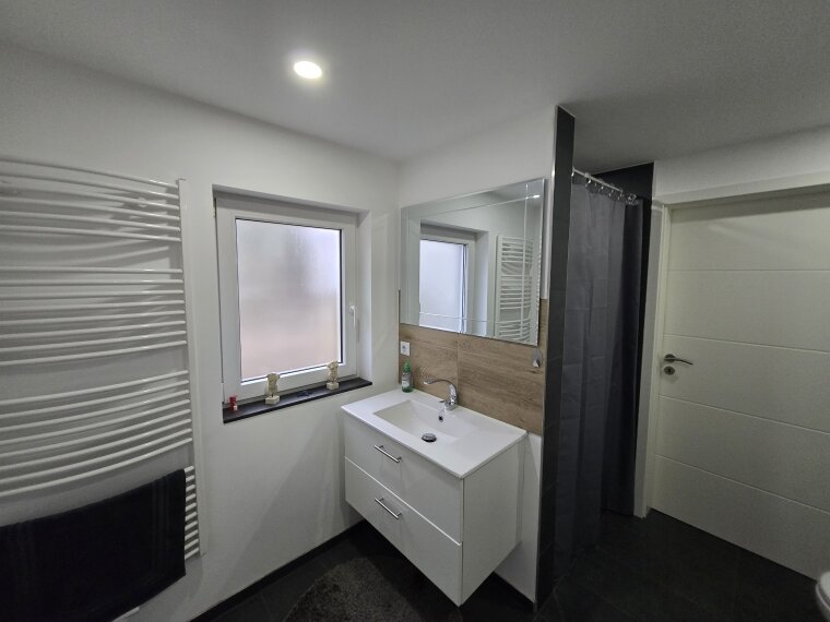 Modernes Badezimmer: Ausgestattet mit Badewanne, Dusche und Fenster für Tageslicht und Frischluft.