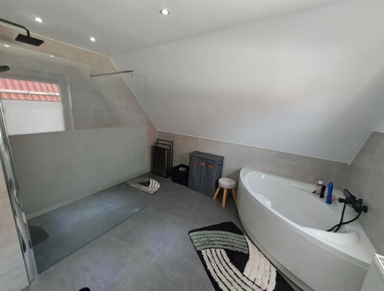 Großes, attraktives Bad mit bodentiefer Dusche und Eckbadewanne