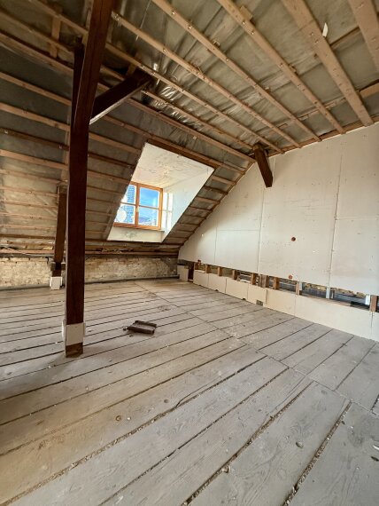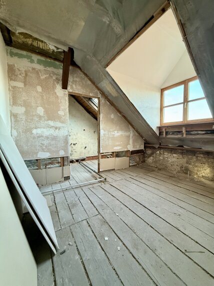 Zwei nach Süden ausgerichtete Balkone eröffnen Ihnen eine herrliche Weitsicht und laden zum Verweilen und Entspannen ein. Der Dachgeschossbereich wurde in den 1990er-Jahren ausgebaut und bis 2020 als Wohngemeinschaft vermietet. Die vorhandenen Wände wurden brandschutztechnisch optimiert, und im Jahr 2023 wurden im Rahmen der geplanten Sanierung Boden, Decken sowie die Heizungsverrohrung vollständig zurückgebaut. Somit präsentiert sich das Objekt im Rohbauzustand, was Ihnen die Möglichkeit gibt, Ihre individuellen Vorstellungen und Wünsche zu verwirklichen.