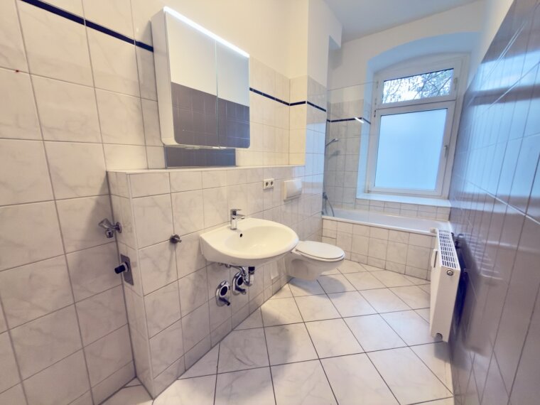 Das helle Tageslichtbad mit Fenster, Wanne und Duscharmatur wurde 2023 überwiegend erneuert. Kunststofffenster mit 2-fach-Verglasung, gepflegte Oberflächen sowie ein Kellerabteil ergänzen den Wohnkomfort.