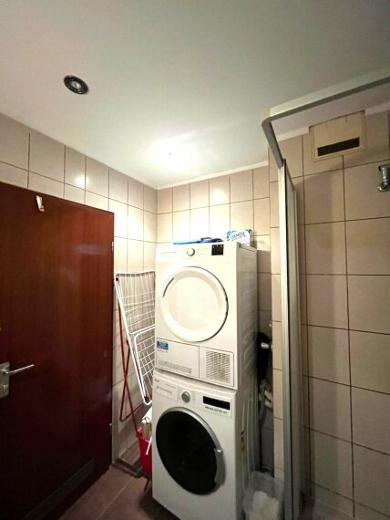 Badezimmer mit Dusche und Waschmaschinenanschluss