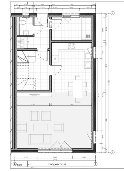 • Einen sehr großen Wohnbereich mit breiter Fensterfront (Fensterpositionen u. a. W-04t 3000×2250 mm)