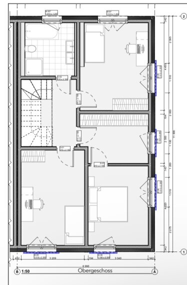 Das Wohnhaus ist modern, funktional und lichtdurchflutet geplant. Große Fensterflächen, offene Wohnbereiche und ein vollwertig nutzbares Dachgeschoss sorgen für ein helles und freundliches Raumgefühl. Die Architektur zeigt klar gezeichnete Linien, eine ästhetische Fassadengliederung und hochwertige Fensterformate.