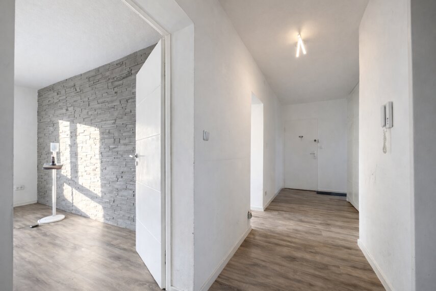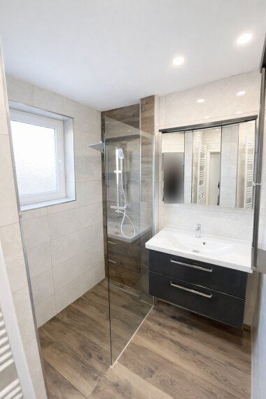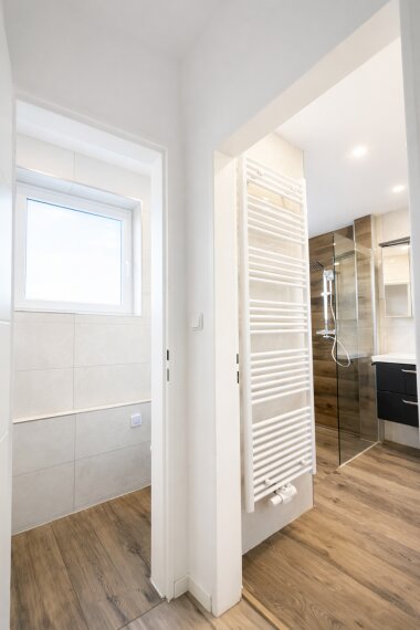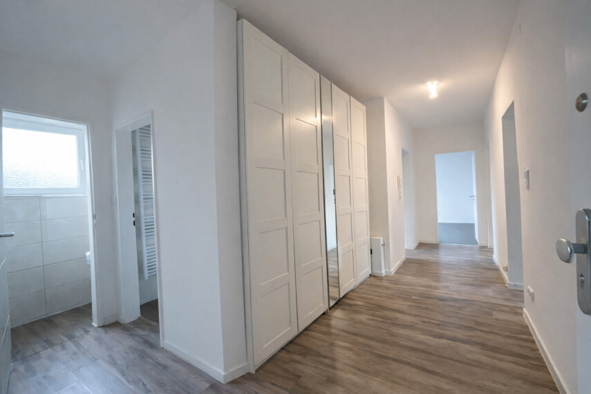 Der großzügige Eingangsbereich führt Sie in alle Räume der Wohnung. Direkt zu Beginn fällt der Blick auf das moderne Badezimmer mit Dusche und das separate Gäste-WC, die beide im Jahr 2024 vollständig renoviert wurden. Sie präsentieren sich in einem stilvollen, zeitgemäßen Design mit hochwertigen Ausstattungsdetails, die den Wohnkomfort unterstreichen.