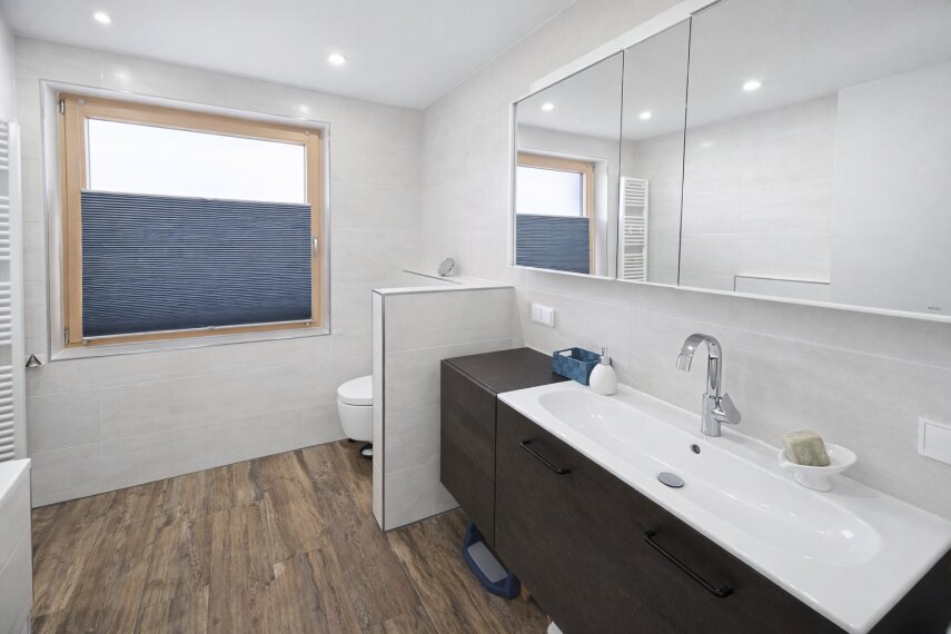 Der Keller ist zu großen Teilen wohnlich nutzbar und überwiegend gefliest; in einem beheizten Raum wurde zuletzt Laminat verlegt. Neben der großen Tiefgarage mit Hörmann-Rolltor und Starkstromanschluss stehen ein Waschraum, ein weiterer beheizter Raum sowie ein Partyraum mit hochwertiger Bar aus Eichenholz zur Verfügung. Ein separates Duschbad (Dusche, WC, Waschbecken) ergänzt das Raumangebot. Die Heiztechnik wurde 2023 modernisiert: installiert ist eine Solvis-Heizungsanlage mit 750-l-Pufferspeicher in Kombination mit einer Luft-Wasser-Wärmepumpe. Eine Thermosolaranlage auf dem Dach unterstützt die Warmwasser- und Heizwasserversorgung vom Frühjahr bis Herbst. Der Keller verfügt zudem über einen separaten Zugang; die Kellerfenster wurden 2022 erneuert.