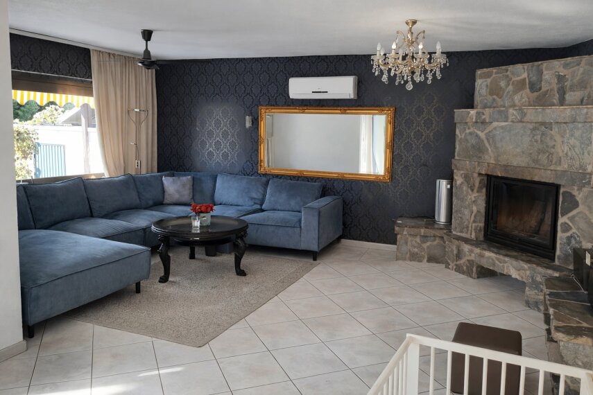 Beim Betreten des Hauses umhüllt Sie eine freundliche, helle Atmosphäre. Die eleganten Fliesenböden kombinieren stilvolle Optik mit pflegeleichter Funktionalität. Das großzügige Wohnzimmer bildet das Herzstück der Immobilie. Ein Kamin sorgt für wohlige Wärme und lädt zu entspannten Abenden mit Familie und Freunden ein. Große Fenster lassen viel Tageslicht hinein und bieten direkten Zugang zur weitläufigen Terrasse.
