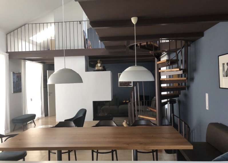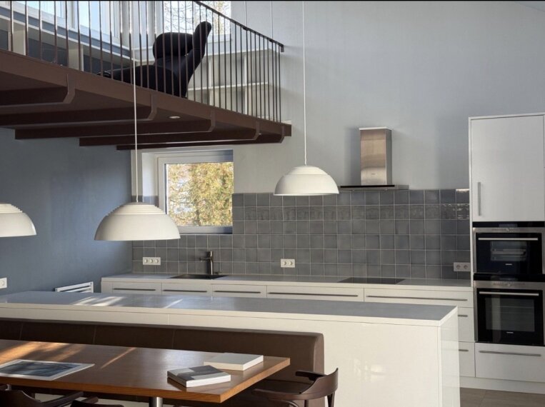 Bereits beim Betreten des Haupthauses empfängt ein großzügiger Eingangsbereich mit maßgefertigten Einbauschränken und einem stilvollen Gäste-WC. Das Haus gliedert sich architektonisch in drei Bereiche: den repräsentativen Salon, den privaten Schlaftrakt sowie das Obergeschoss. Herzstück der Villa ist der loftartige Salon mit rund 60 m², der Kochen, Essen, Wohnen und Bibliothek in einem offenen Raumkonzept vereint. Eine Empore beherbergt den Medien- und Rückzugsbereich, während ein dreiseitig verglaster Kamin im Wohnbereich für behagliche Atmosphäre sorgt. Großzügige Fensterfronten nach Osten, Süden und Westen fluten den Raum ganzjährig mit Tageslicht und öffnen sich zur etwa 40 m² großen Terrasse mit unvergleichlichem Blick auf den See.