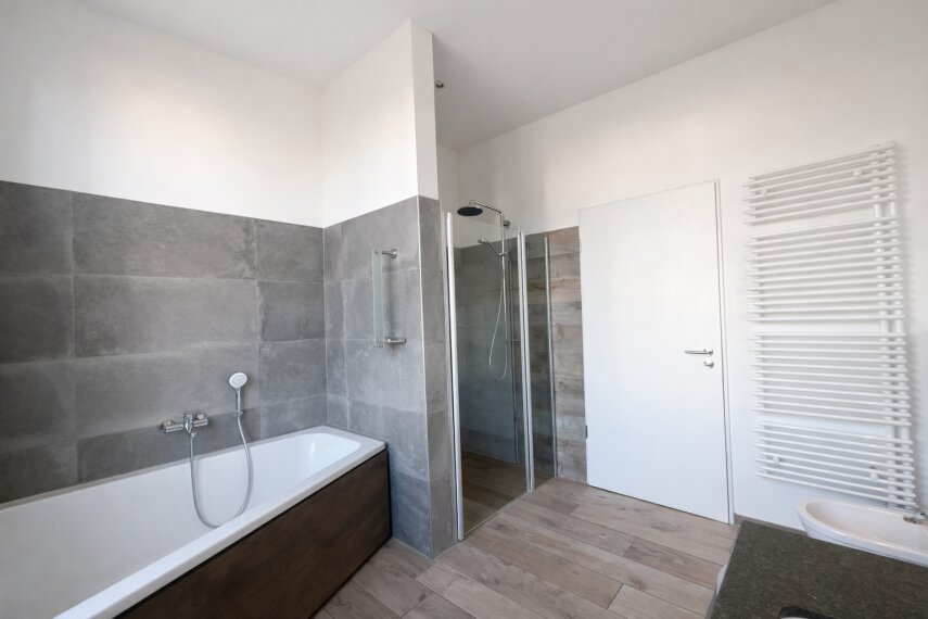 Das Badezimmer zeichnet sich durch Modernität und Eleganz aus, ausgestattet mit großformatigen Fliesen, einer bodengleichen Dusche und erstklassigen Sanitärelementen. Ein praktischer Hauswirtschaftsraum mit Waschmaschinenanschluss und zusätzlichem Spülbecken gewährleistet reibungslose Abläufe im Alltag.