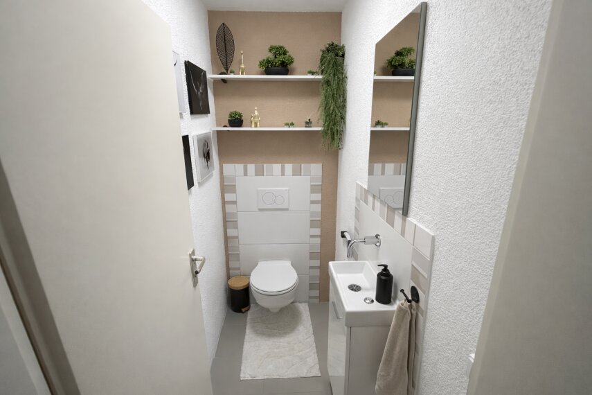 Das Badezimmer ist mit einer Badewanne ausgestattet und besticht durch seine moderne und gepflegte Gestaltung. Ein separates Gäste-WC erhöht den Wohnkomfort zusätzlich.