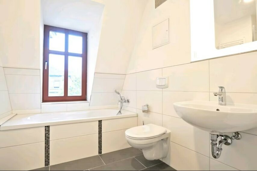 Das Badezimmer ist ein wahres Highlight: Mit einem Fenster, einer komfortablen Badewanne sowie einer separaten Dusche erfüllt es höchste Ansprüche an Funktionalität und Komfort. Die maßgefertigte Einbauküche ist mit hochwertigen Geräten ausgestattet und bietet ausreichend Platz für kulinarische Abenteuer.