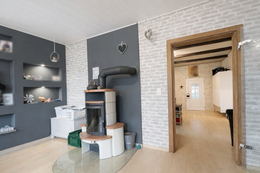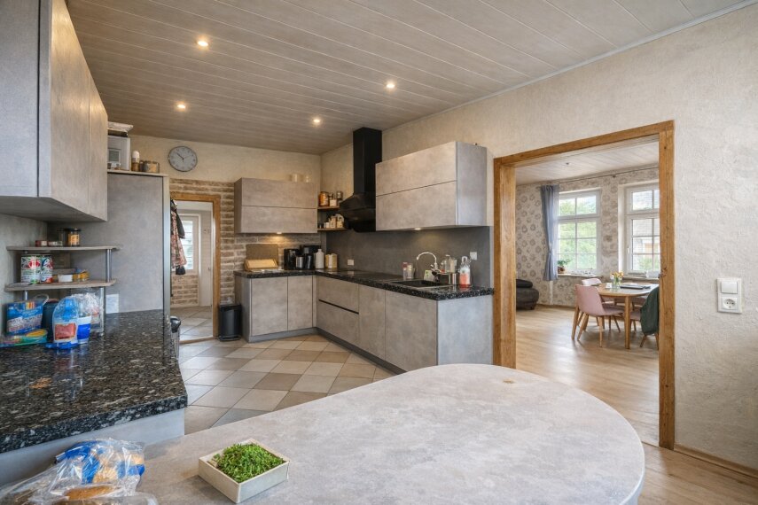 Für eine besondere Wohnatmosphäre sorgen insgesamt drei Kamine, die dem Haus zusätzlichen Charme verleihen. Die vorhandene Einbauküche mit hochwertiger Stein-Arbeitsplatte ist im Kaufpreis enthalten.