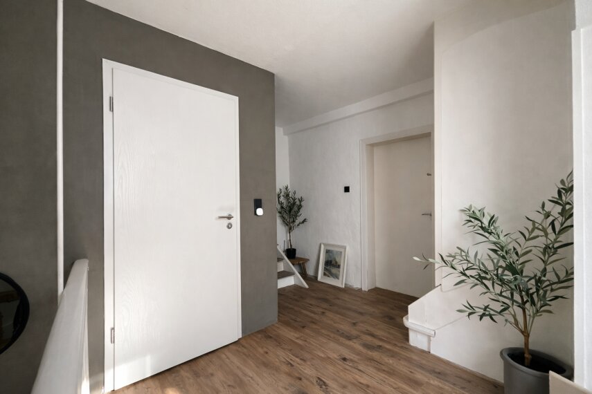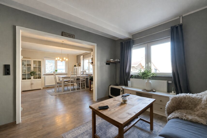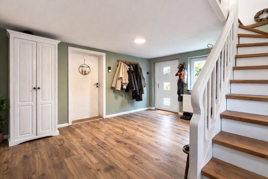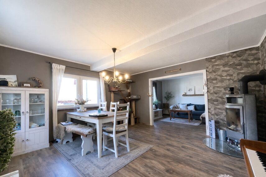 Beim Betreten des Hauses gelangt man in den zentralen Flurbereich, von dem aus die Küche, das Wohn- und Esszimmer, der Keller sowie das Obergeschoss erreichbar sind. Rechts befindet sich die Küche inklusive Einbauküche, die bereits im Kaufpreis enthalten ist. Geradeaus öffnet sich das gemütliche Wohn- und Esszimmer mit Kamin, das eine angenehme Wohnatmosphäre schafft.