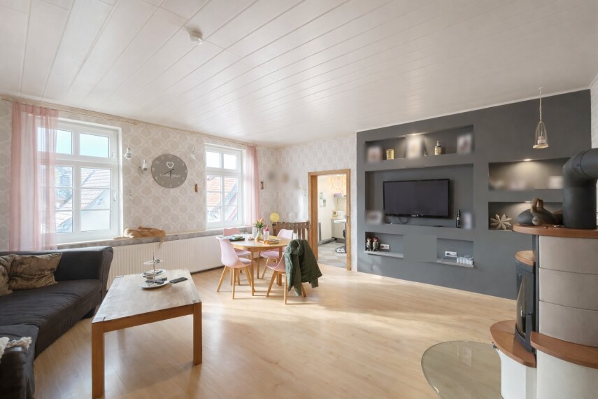 Die Wärmeversorgung des Hauses wird durch eine zentrale Gasheizung gewährleistet, die im Jahr 2006 installiert wurde. Für eine gute Energieeffizienz sorgen Fenster mit Isolierverglasung. Abgesehen von der großflächigen Fensterfront im Obergeschoss wurden im Jahr 2022 alle übrigen Fenster durch moderne Kunststofffenster mit elektrisch steuerbaren Rollläden ersetzt. Die offen gestalteten Wohn- und Küchenbereiche auf beiden Etagen schaffen ein helles, einladendes Ambiente und vermitteln ein großzügiges Raumgefühl. Die Innenwände bedürfen noch eines neuen Putzes; diese Arbeiten wurden im Zuge des Verkaufs nicht mehr ausgeführt und liegen nun im Verantwortungsbereich der künftigen Eigentümer.