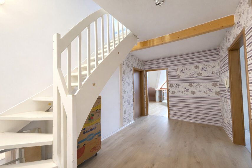 Die zweite Wohneinheit verfügt über einen eigenen Zugang und ist über ein separates Treppenhaus erreichbar. Im Obergeschoss befinden sich ebenfalls drei Schlafzimmer, ein großzügiger Wohnbereich mit offener Küche sowie zwei Badezimmer – eines mit Dusche und WC, das andere mit Badewanne.