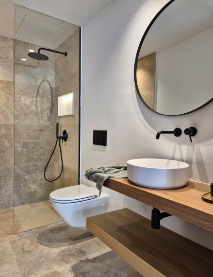 Der offene, gemütliche Wohnbereich im Erdgeschoss ist mit Natursteinboden verlegt und lädt zur vollkommenen Entspannung ein. Dort finden wir das Wohnzimmer mit Kamin, den Essbereich und die Küche. Außerdem ist hier ein Gäste-WC sowie ein Hauswirtschafsraum vorhanden. Der Zugang zum Außenbereich mit großer Terrasse und Pool ist gleitend.